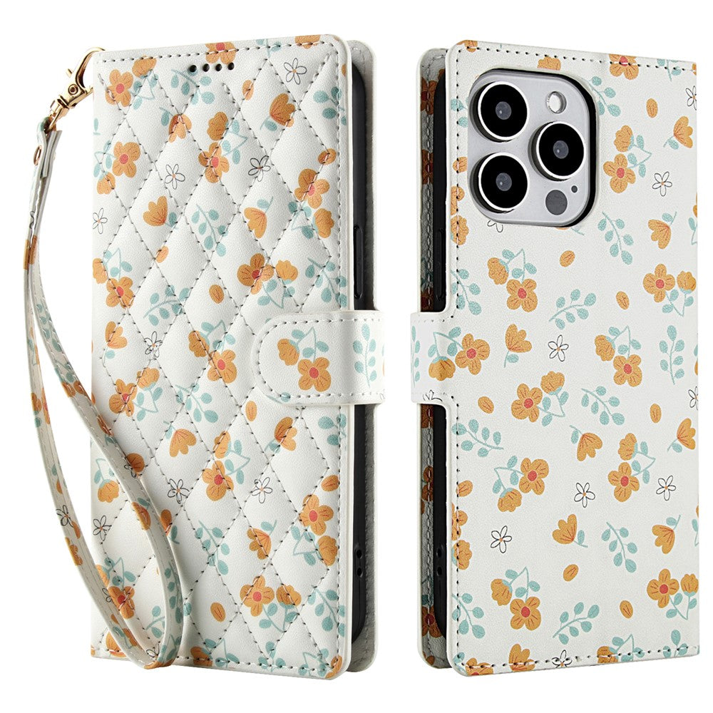 For iPhone 16 Pro Max Wallet Case Rhombic Floral Design Leather Flip Phone Cover with Strap