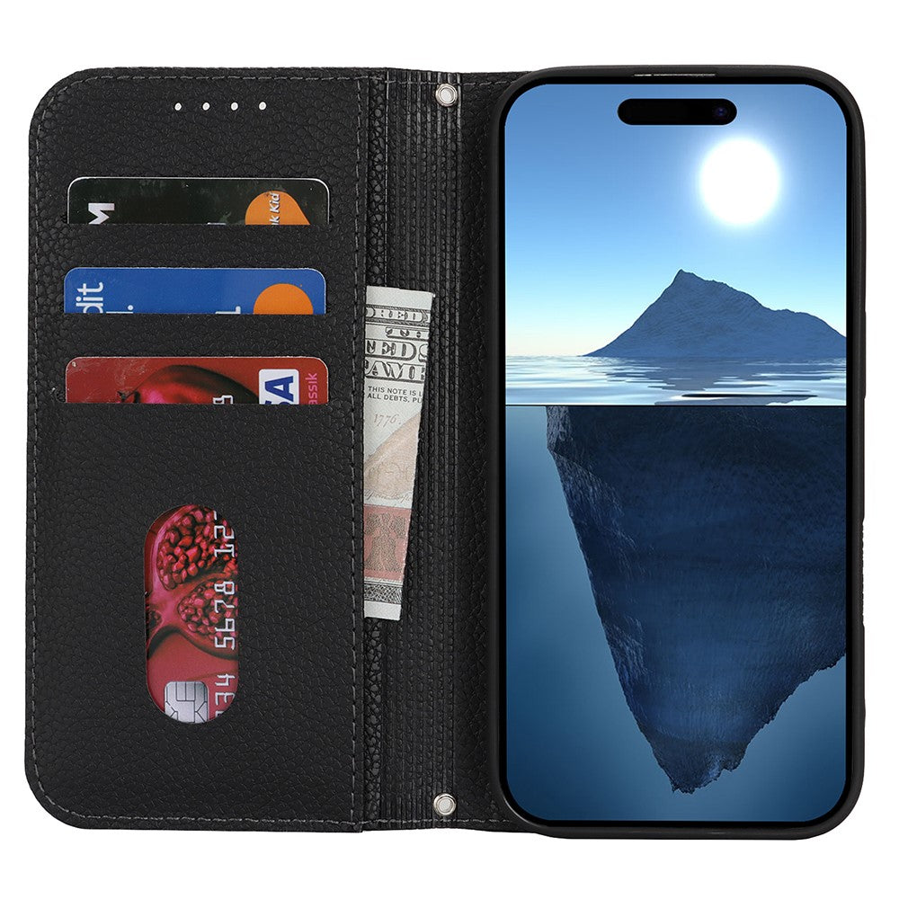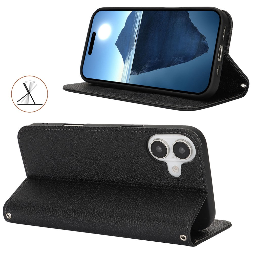 Stand Case for iPhone 16 Litchi Texture Leather Flip Phone Cover with Strap  /  Wallet
