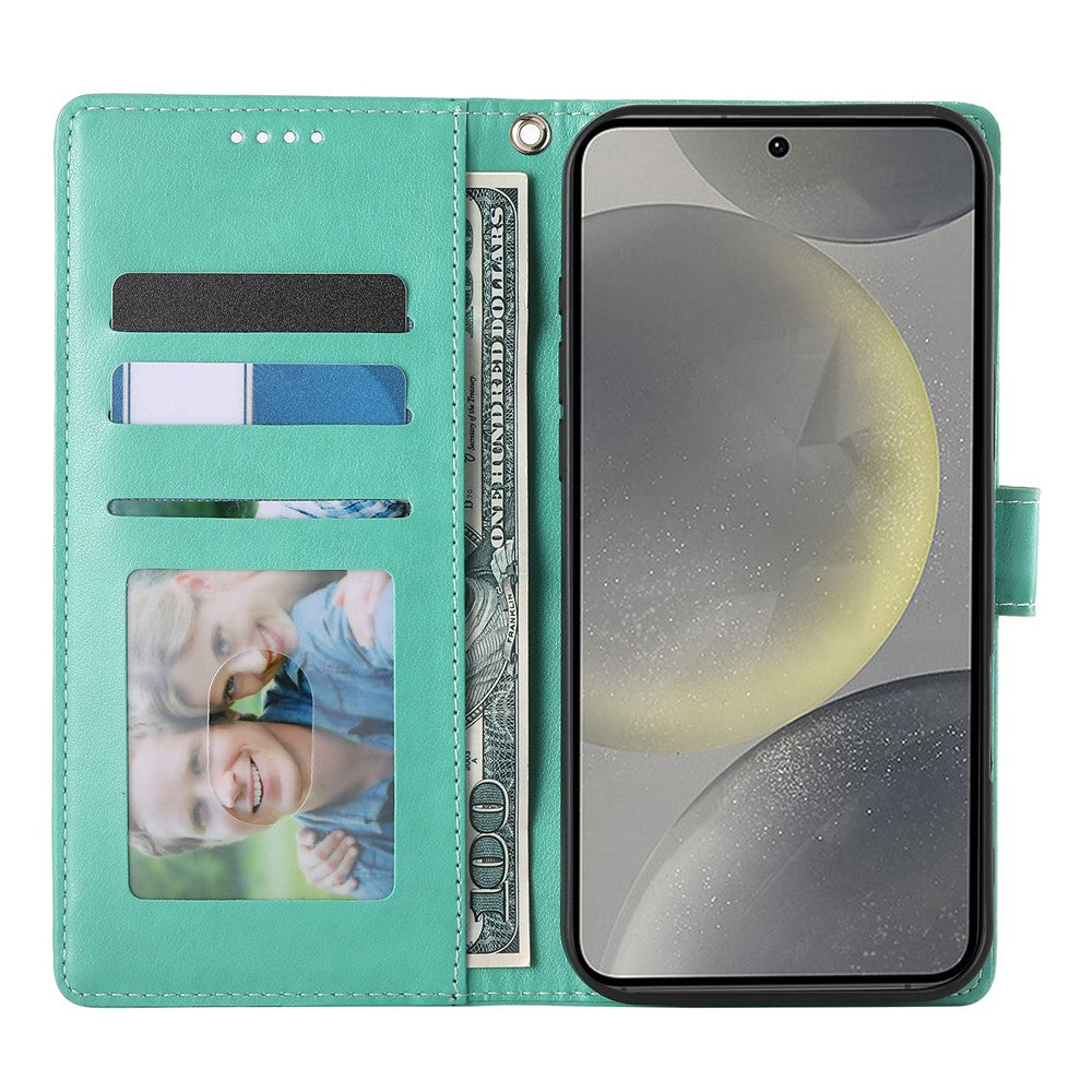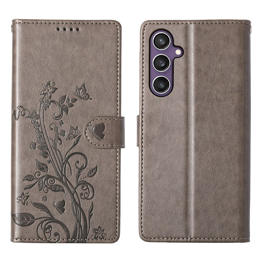 For Samsung Galaxy S25 Wallet Case Butterfly Floral Imprint PU Leather Phone Cover with Wrist Strap